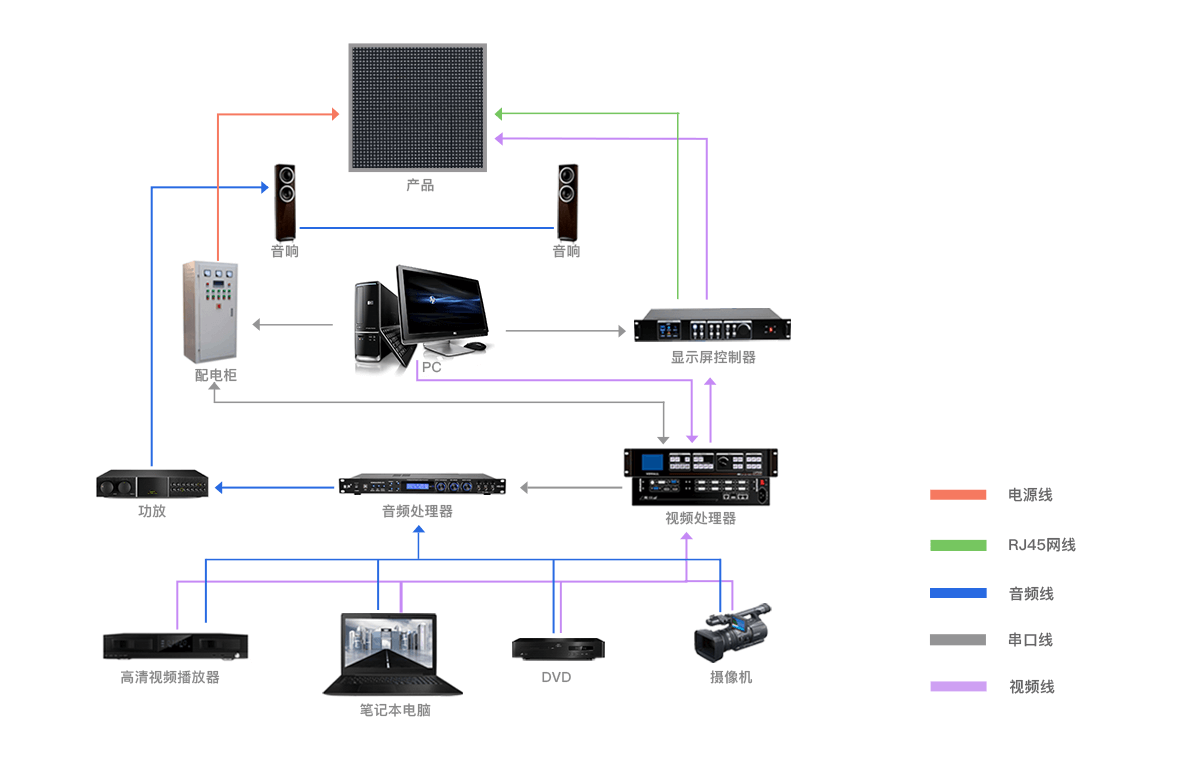 以多屏處理器為中心,周邊連接LED顯示設(shè)備、視頻信號源、音頻信號源、播控設(shè)備、環(huán)境控制、操作終端,集中對周邊信號控制、環(huán)境集控、統(tǒng)一部署、方便控制。用一套軟件系統(tǒng)、一套硬件系統(tǒng)就可以完成復(fù)雜、繁重的設(shè)置、控制、操作任務(wù)。